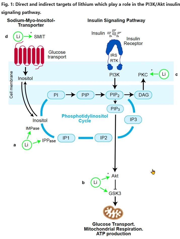 Insulīna receptoru signalizācijā inozitola cikls ir mega svarīgs — tas ir fosfatidilinozitola (PI) signalizācijas pamats, kas rada sekundārās signālmolekulas kā IP₃ un DAG, kas aktivizē insulīna PI3K/Akt ceļu, ievilkdami glikozi šūnās caur GLUT un iedarbinot glikolīzi. Šo ciklu regulē arī litijs. Un šī regulācija var aiziet pa pieskari: